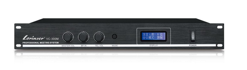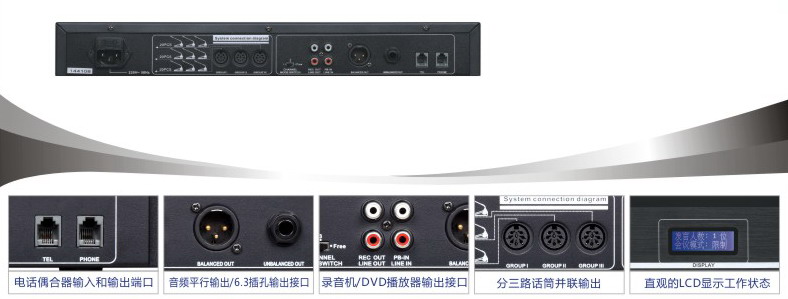 可用来召开远程电话会议设有音调调节、电话输入和总音量输出调节器每一个系统主机可以连接90个话筒单元,